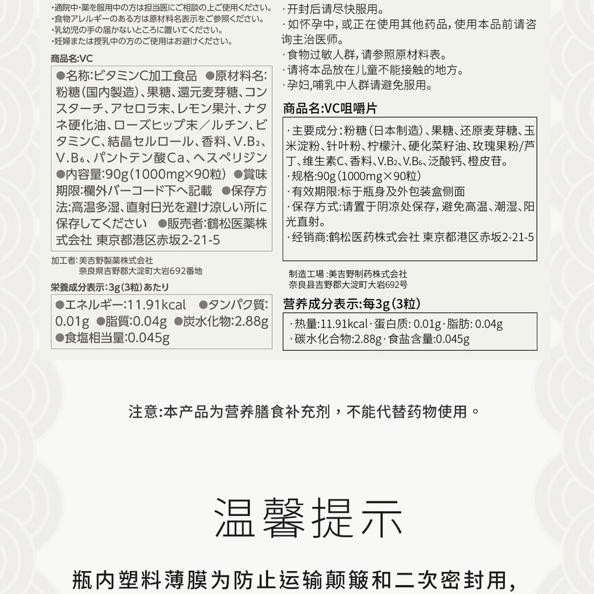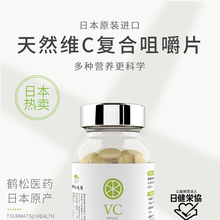 鹤松医药日本天然VC维生素C咀嚼片孕妇青少年成人中老年人增强免疫力抗氧化256mg*90片装单瓶体验装