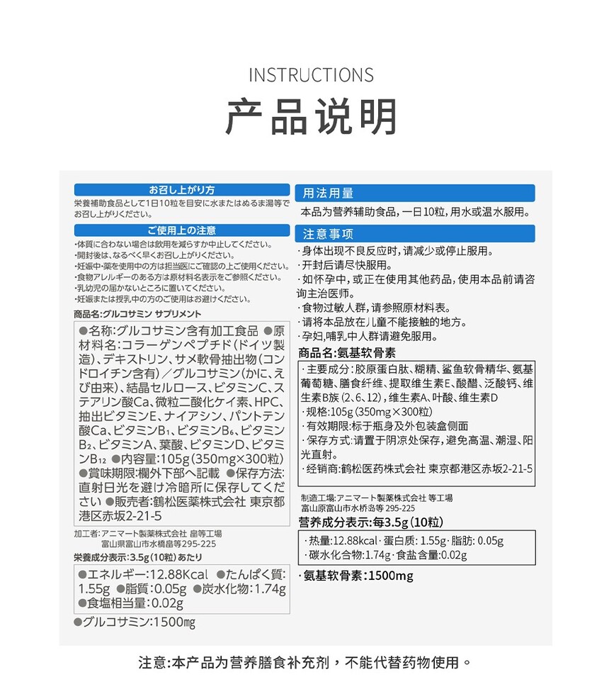 日本鹤松医药氨糖软骨素中老年关节 单瓶装